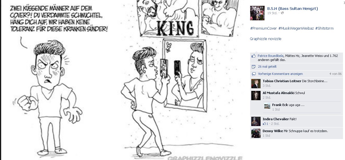 Die Frontseite zeigt zwei Männer beim leidenschaftlichen Kuss. Für manche Fans ist das nicht mit den eigenen Wertvorstellungen vereinbar. Getrieben von der antiquierten Vorstellung, Homosexualität habe im deutschen Hip Hop nichts zu suchen, kündigten dem Rapper binnen kürzester Zeit über 100 Fans die Twitter- und Facebook-Freundschaft, dazu der übliche Wust aus unflätigen Kommentaren.