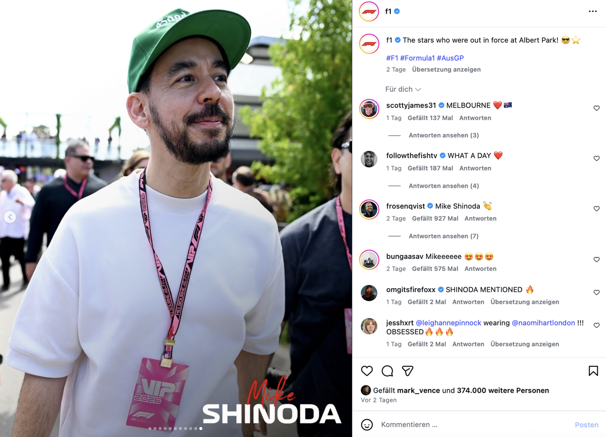 Begonnen hat die aktuelle Formel-1-Saison vergangenes Wochenende in Australien – unter den Augen von Linkin Park-Chef Mike Shinoda. Der tauchte schon zum zweiten Mal binnen weniger Monate bei einem Grand Prix auf, würde mich also nicht wundern, wenn bei Linkin Park ebenfalls eine künftige Kollaboration mit der Rennserie im Hintergrund schwelt ... Fehlen eigentlich nur noch Volbeat, die ihr Max-Verstappen-Fandom ja mittlerweile bei jedem Konzert plakativ raushängen. Döp döp dödöp!