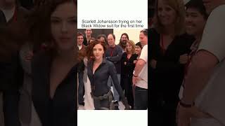 Scarlett Johansson trying on her Black Widow suit for the first time