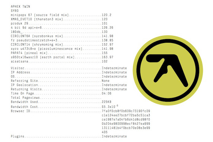 Am 18. August, James' Geburtstag, setzte Aphex Twin den ersten Tweet seit über zwei Jahren ab. Die Botschaft bestand einzig und allein aus einem Link, der sich nur mit dem Tor-Browser öffnen lässt. Folgt man der Adresse, gelangt man zu untenstehendem Bild und der abgebildeten, mutmaßlichen Tracklist eines neuen Aphex Twin-Albums namens "SYRO".