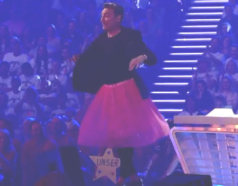 Wie eine turmhohe Hochzeitstorte anmutend sang sie die von Dieter Bohlen komponierte Pop-Ballade "Königlich". Mousse T. kommentierte das zweifelhafte Bühnen-Outfit auf seine Weise.